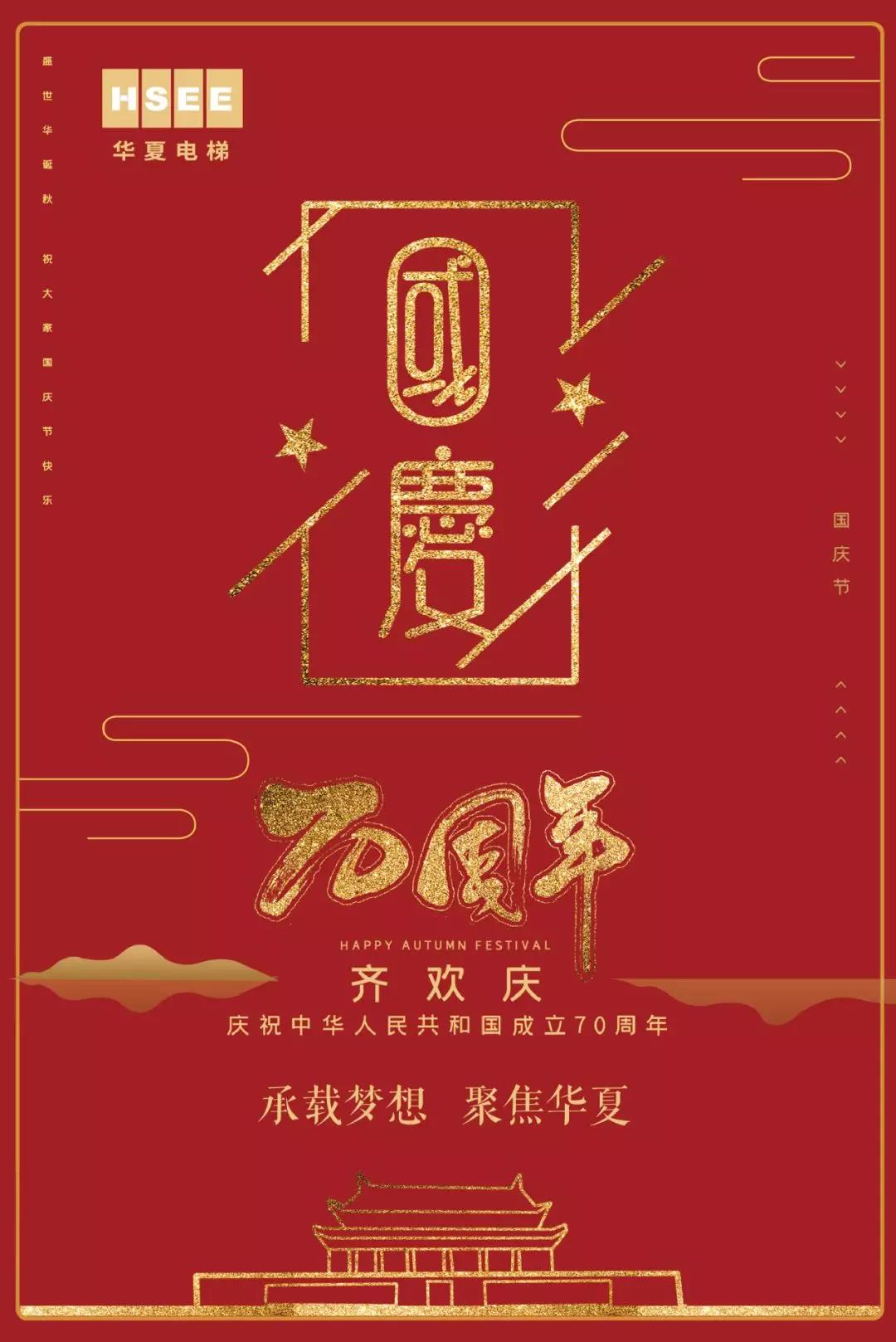 金秋十月迎国庆,举国同庆贺生辰;繁花似锦添新颜,乐曲如潮唱和平;祖国繁荣享生活,阖家欢乐品幸福。华夏大地沉浸在新中国成立70周年喜悦之中,浙江华夏电梯股份有限公司祝各位股东、合作伙伴、亲朋好友身体健康、阖家欢乐。